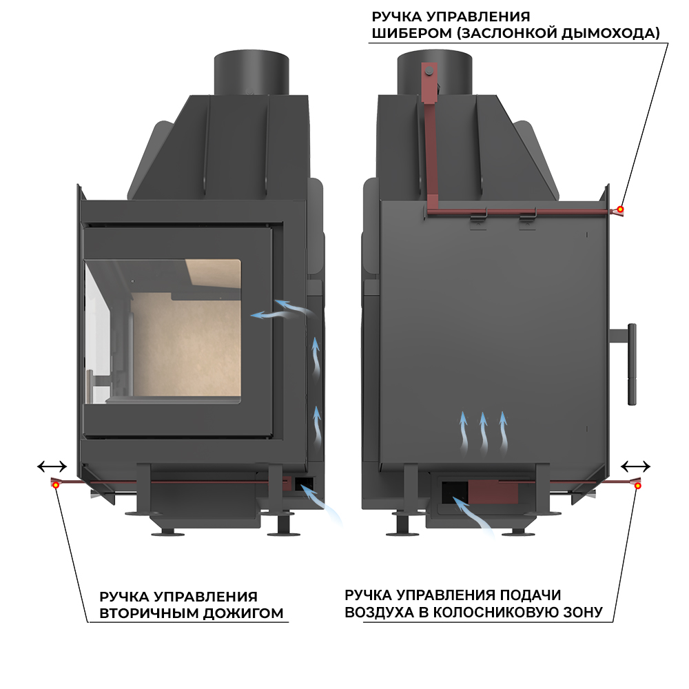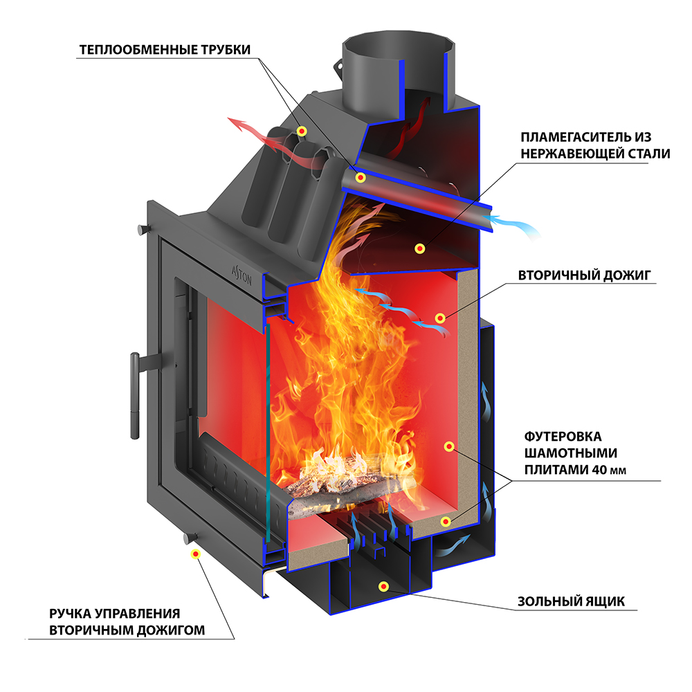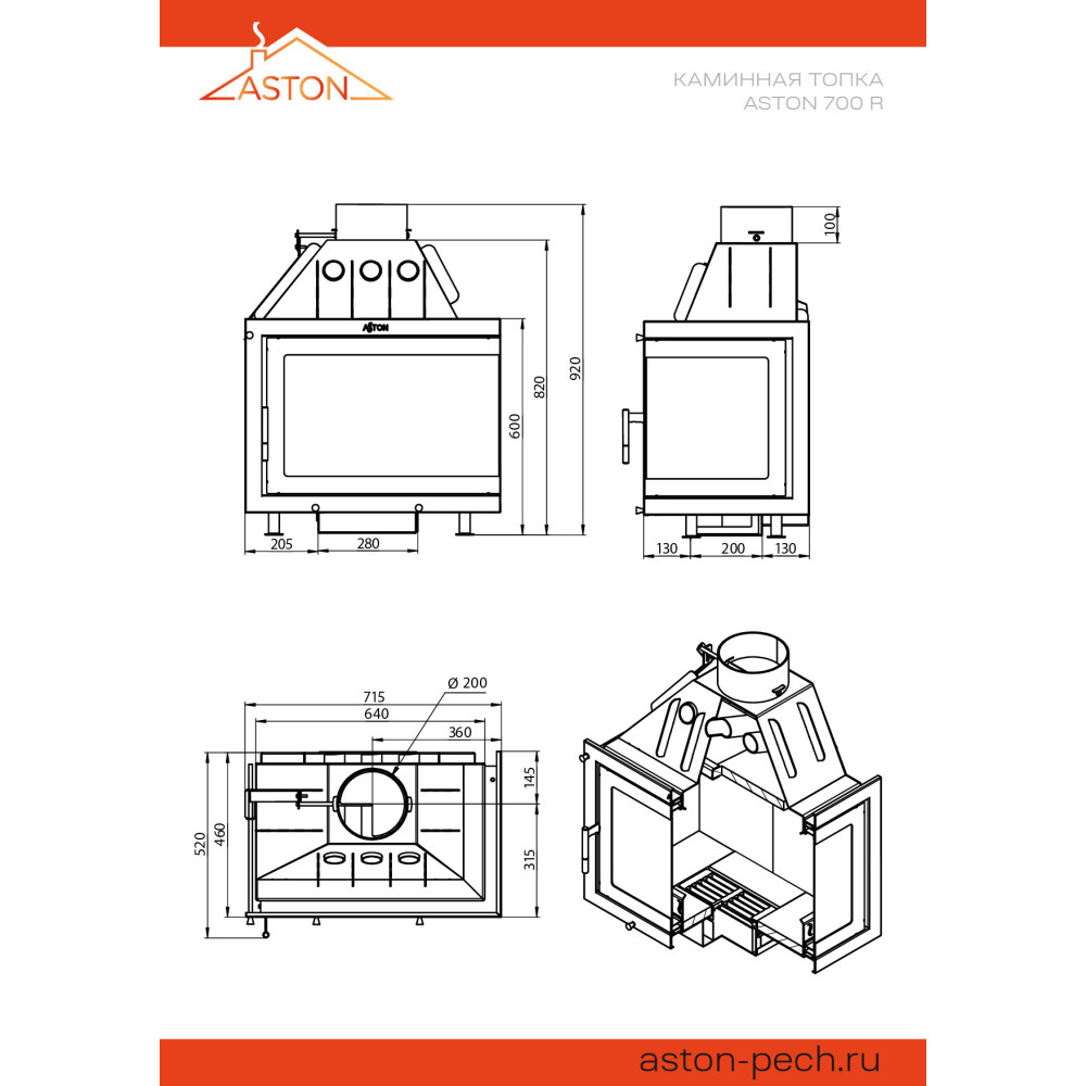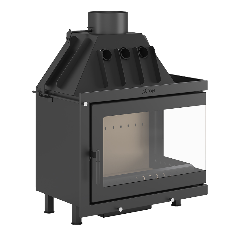 Стальная каминная топка АСТОН 700 R предназначена для помещений объёмом до 280 куб.м. Топочная камера изготовлена из особо прочной котловой стали, рассчитана на пристенное размещение. Топка изнутри облицована шамотом, что обеспечивает максимальную теплоёмкость печи. Облицовка защищает стены от прогорания и избыточного нагрева. Топка оборудована системой вторичного дожига дымовых газов, которая позволяет получить максимум энергии при горении дров. Каналы вторичного дожига расположены на задней стенке топочной камеры непосредственно в облицовке. Управление вторичным дожигом вынесено на переднюю панель топки. Тяга регулируется за счёт шибера, встроенного в патрубок дымохода диаметром 200 мм. Ручка управления шибером размещается на передней поверхности топки, справа вверху.