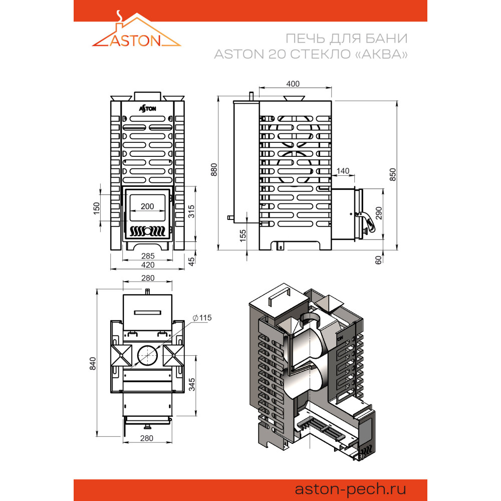 Печь ASTON 20 "АКВА" со стеклянной дверцей из особо прочной котловой стали марки 09Г2С предназначена для установки в парную объемом до 22 м3. Стальной кожух значительно ускоряет нагревание воздуха, вмещает в себя до 160 кг камней для бани. Глубокая невентилируемая каменка-труба толщиной 4 мм выполняет роль пламегасителя. Универсальный парогенератор проходит через каменку-трубу, обеспечивая получение мелкодисперсного пара. Дверца со стеклом из особо прочной котловой стали марки 09Г2С позволяет обслуживать топку и регулировать скорость горения топлива в печи. Колосниковая решетка из литьевого чугуна обеспечивает равномерное и мощное горение дров.