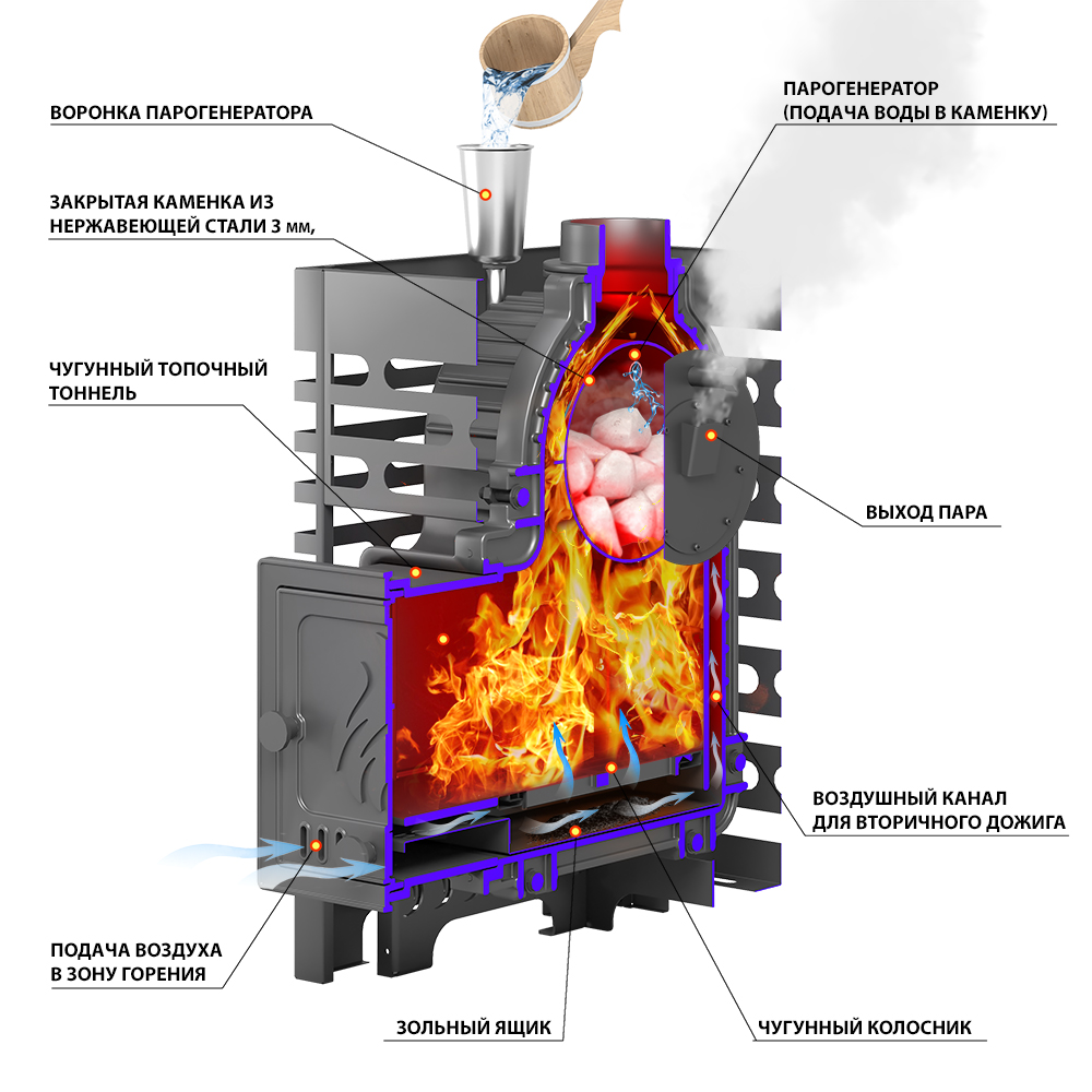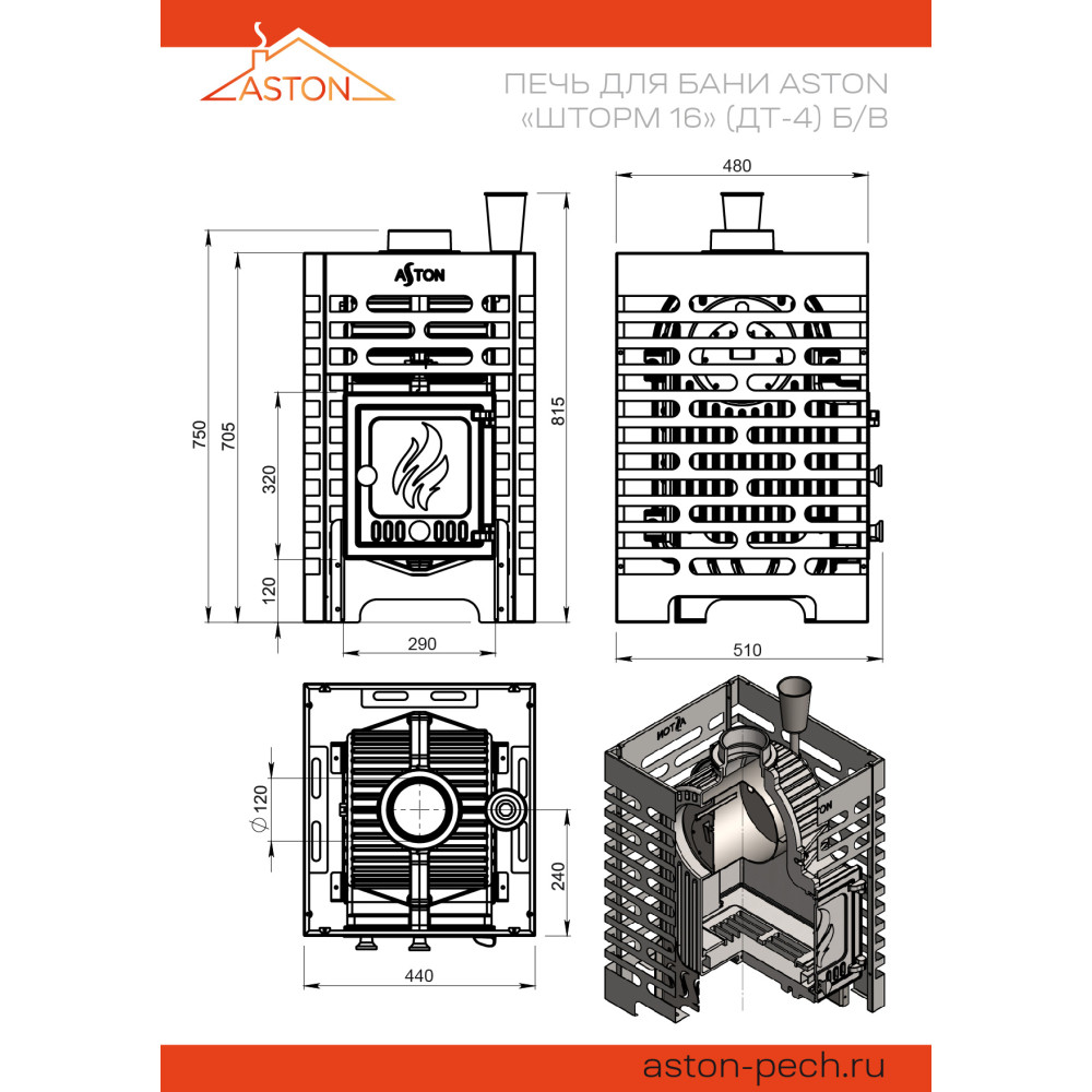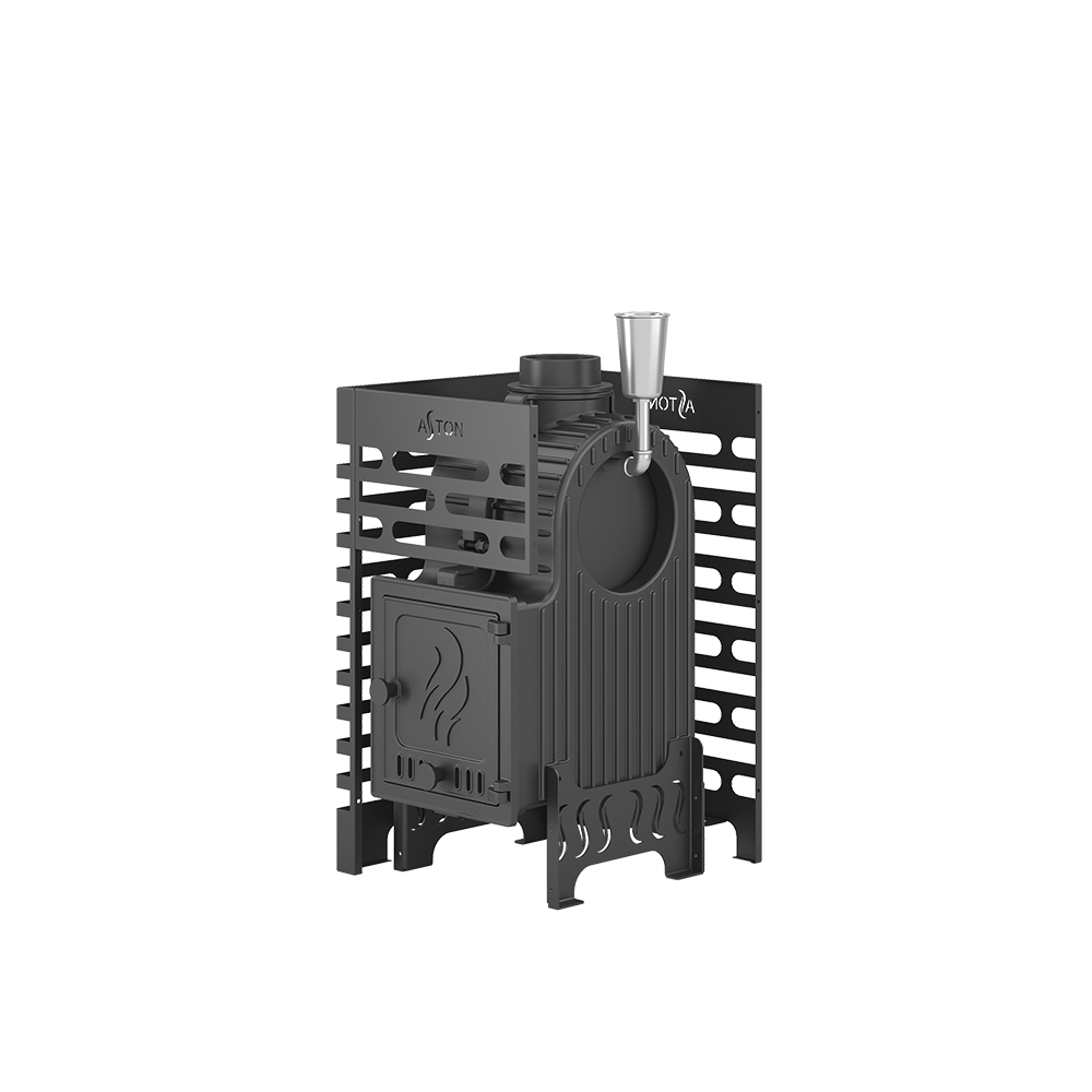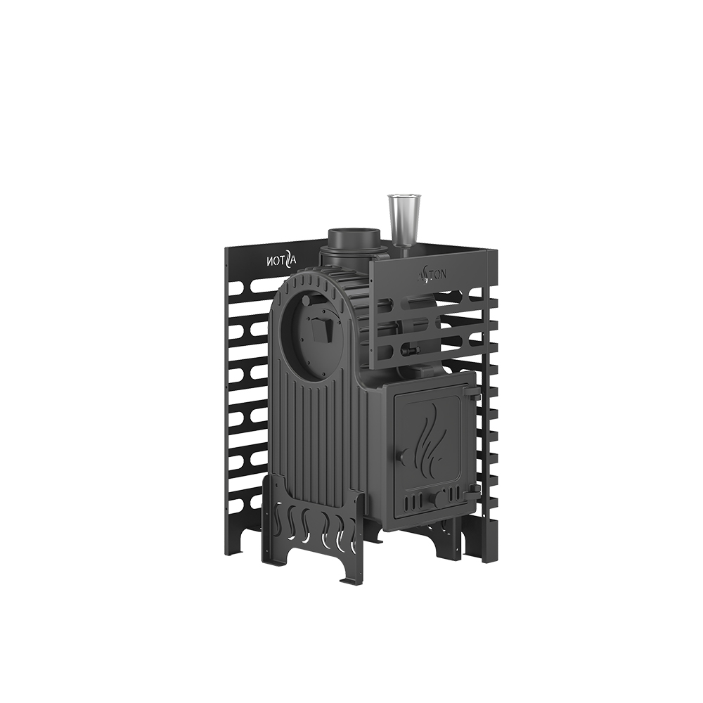 Печь для бани ASTON «Шторм 16» (ДТ-4) б/в из жаростойкого чугуна (ГОСТ 1412-85) предназначена для установки в парную объемом до 16 м3. Конструкция печи включает в себя закрытую каменку из нержавеющей стали марки AISI-430 толщиной 3 мм, расположенную в верхней части топки. Каменка рассчитана на 15 кг камней мелкой и средней фракции. Стальной кожух значительно ускоряет нагревание воздуха, вмещает в себя до 100 кг камней для бани. Дверца из жаростойкого чугуна (ГОСТ 1412-85) позволяет обслуживать топку и регулировать скорость горения топлива в печи. Чугунная колосниковая решетка обеспечивает равномерное и мощное горение дров.