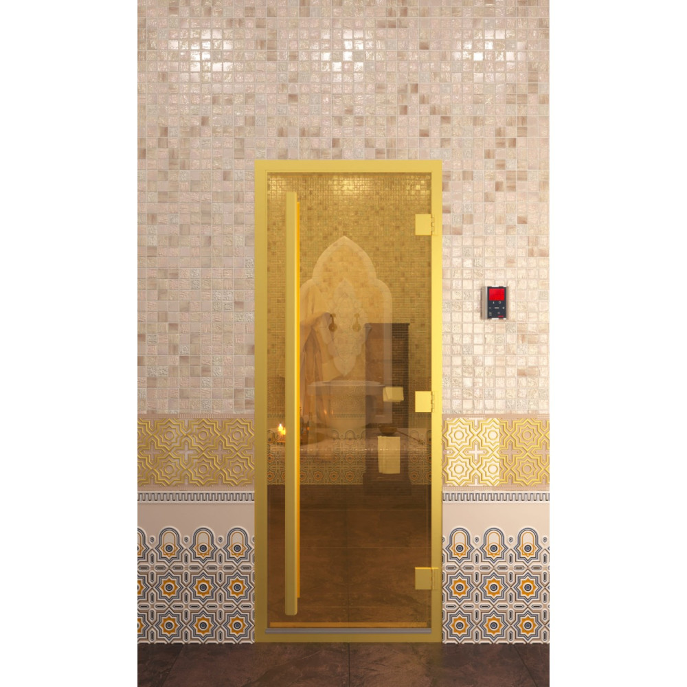 Дверь для хаммама "Золото" 1900х700 изготовлена из закалённого стекла, что делает дверь максимально безопасной.