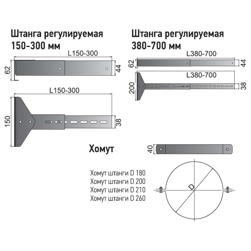 Штанга регулируемая 380-700 предназначена для фиксации дымохода в вертикальном положении с возможностью регулирования расстояния от несущей конструкции. Штанга не является разгружающим элементом. Устанавливается совместно с хомутом штанги регулируемой.