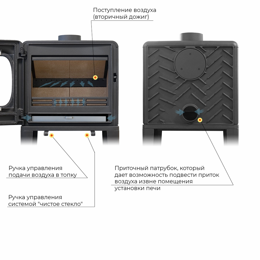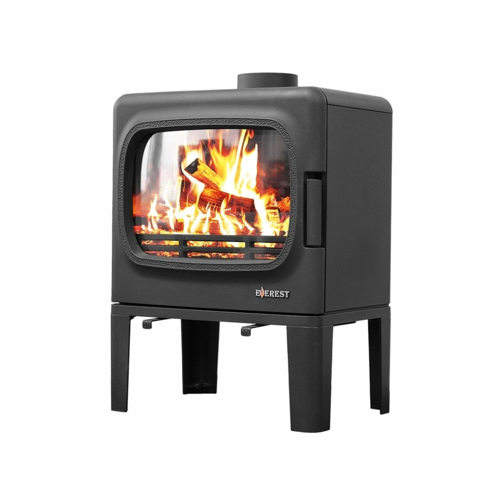 Печь-камин EVEREST F10 изготовлена из качественного жаростойкого чугуна с толщиной стенок 6-8 мм. Модель рассчитана на обогрев помещений объёмом до 200 куб.м. Печь-камин имеет два пламегасителя: самый нагруженный пламегаситель изготовлен из вермикулита, второй из особо прочной котловой стали 09Г2С. Топка печи-камина усилена вермикулитовыми плитами с системой двухуровневого вторичного дожига. С помощью этой функции по каналам подачи вторичного воздуха поступает воздух, который нагревается при прохождении между топочной камерой и стенками корпуса. Далее нагретый воздух через дефлектор поступает в топку, перемешивается с газами - продуктами горения, чем вызывает повторное возгорание. Регулировка этой системы, как и подача воздуха в колосниковую зону, осуществляется рычагом, расположенным слева в нижней части печи-камина. В правой нижней части расположена ручка регулировки системы чистое стекло, которая помогает оставаться стеклу чистым. На задней стенке расположен приточный патрубок, который дает возможность подвести приток воздуха вне комнаты.