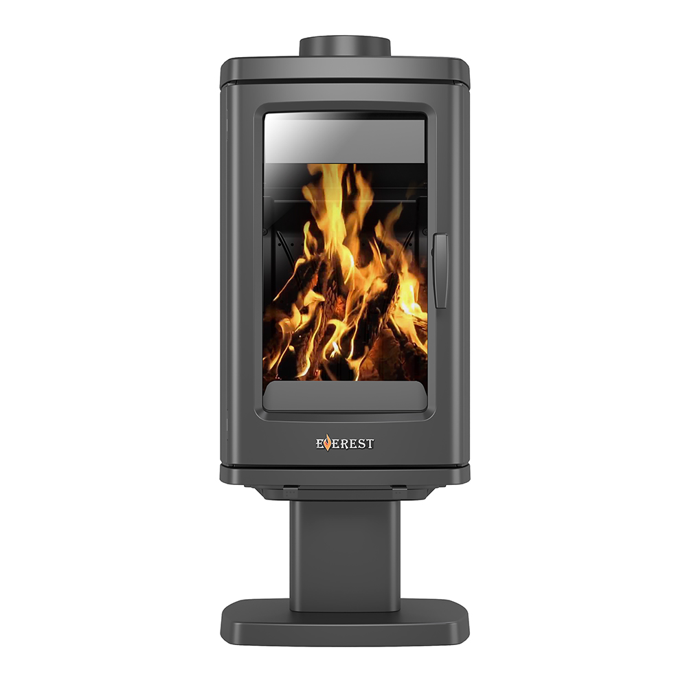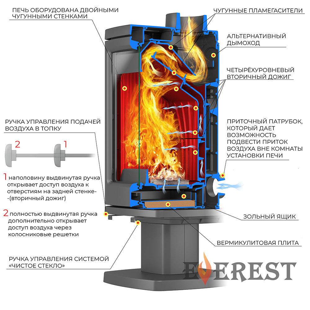 Печь-камин EVEREST H12 изготовлена из качественного жаростойкого чугуна с толщиной стенок 6-8 мм. Модель рассчитана на обогрев помещений объёмом до 240 куб.м. Печь-камин имеет два чугунных пламегасителя, обеспечивающие высокий КПД печи. Топка печи-камина усилена чугунными вставками с системой четырехуровневого вторичного дожига. С помощью этой функции по каналам подачи вторичного воздуха поступает воздух, который нагревается при прохождении между топочной камерой и стенками корпуса. Далее нагретый воздух через дефлектор поступает в топку, перемешивается с газами - продуктами горения, чем вызывает повторное возгорание. Регулировка этой системы, как и подача воздуха в колосниковую зону осуществляется рычагом, расположенным слева в нижней части печи-камина. В правой нижней части расположена ручка регулировки системы чистое стекло, которая препятствует оседанию сажи на внутреннюю поверхность стекла. На задней стенке расположен приточный патрубок диаметром 100 мм, который дает возможность подвести приток воздуха вне комнат.
