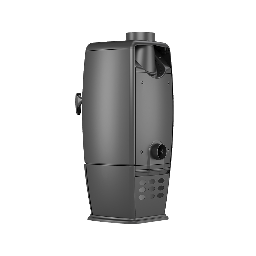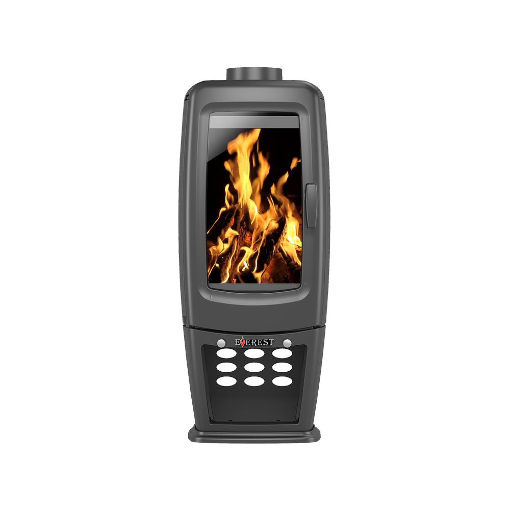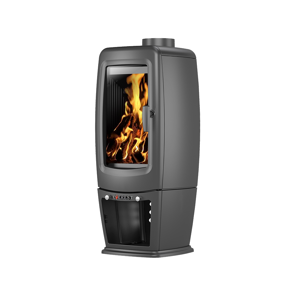 Печь-камин EVEREST S7 изготовлена из качественного жаростойкого чугуна с толщиной стенок 6-8 мм. Модель рассчитана на обогрев помещений объёмом до 140м³. Печь-камин имеет два пламегасителя, самый нагруженный пламегаситель изготовлен из жаростойкого чугуна (ГОСТ 1412-85), второй из особо прочной котловой стали 09Г2С. Топка печи-камина усилена чугунными вставками с системой трехуровневого вторичного дожига. С помощью этой функции по каналам подачи вторичного воздуха поступает воздух, который нагревается при прохождении между топочной камерой и стенками корпуса. Далее нагретый воздух через дефлектор поступает в топку, перемешивается с газами - продуктами горения, чем вызывает повторное возгорание. Регулировка этой системы, как и подача воздуха в колосниковую зону осуществляется рычагом, расположенным слева в нижней части печи-камина. В правой нижней части расположена ручка регулировки системы чистое стекло, которая препятствует оседанию сажи на внутреннюю поверхность стекла. На задней стенке расположен приточный патрубок диаметром 75 мм, который дает возможность подвести приток воздуха вне комнаты.