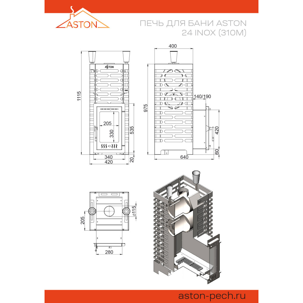 Печь для бани ASTON 24 INOX (310М) из нержавеющей стали марки AISI 430 предназначена для установки в парную объемом до 26 м3. Печь быстро нагревается и легко отдаёт тепло. Стальной кожух открытой каменки вмещает в себя до 180 кг камней для бани. Закрытая каменка позволяет получать мелкодисперсный пар в режиме русской бани. Дверца позволяет обслуживать топку и регулировать скорость горения топлива в печи. Для эффективного сгорания топлива предусмотрен канал для подачи воздуха на вторичное горение.