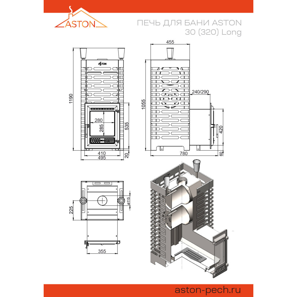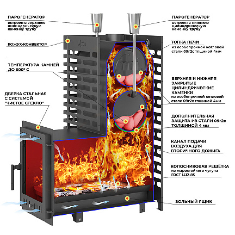 Печь ASTON 30 (320М) Long со стеклянной дверцей из особо прочной котловой стали марки 09Г2С предназначена для установки в парную объемом до 32 м3. Стальной кожух значительно ускоряет нагревание воздуха, вмещает в себя большое количество камней для бани. Глубокая невентилируемая каменка-труба толщиной 4 мм выполняет роль пламегасителя. Универсальный парогенератор проходит через каменку-трубу, обеспечивая получение мелкодисперсного пара. Дверца со стеклом позволяет обслуживать топку и регулировать скорость горения топлива в печи. Колосниковая решетка из литьевого чугуна обеспечивает равномерное и мощное горение дров.