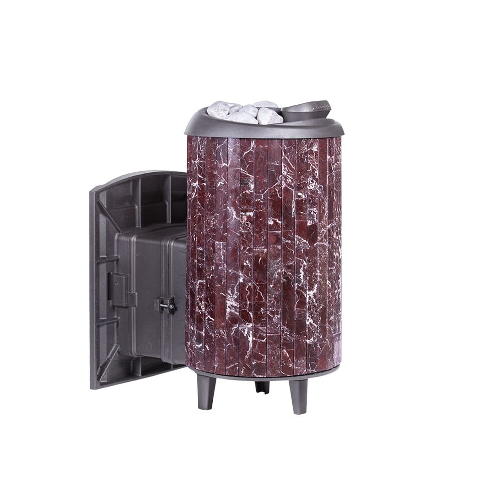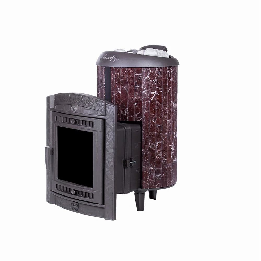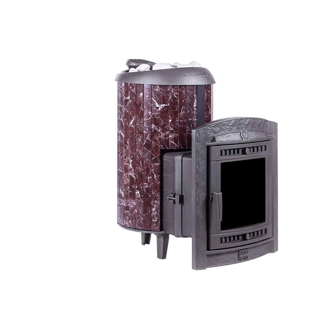 Дровяная печь Атмосфера L в ламелях из натурального камня Россо Леванто наборный - практичная и компактная модель. Ламели из натурального камня по периметру внешней каменки не только обладают хорошими теплонакопительными свойствами, но и придают печи оригинальный внешний вид. При изготовлении печи используется жаропрочный чугун с добавлением хрома. Закрытая каменка выполнена из стали марки AISI 439. Толщина чугунных стенок топочной камеры составляет 9-11 мм, каменки 3 мм. Большая масса камней и закрытая каменка позволяют получить режим русской бани и сохранять температуру долгое время. Толщина жаростойкого стекла топочной дверцы составляет 4 мм.