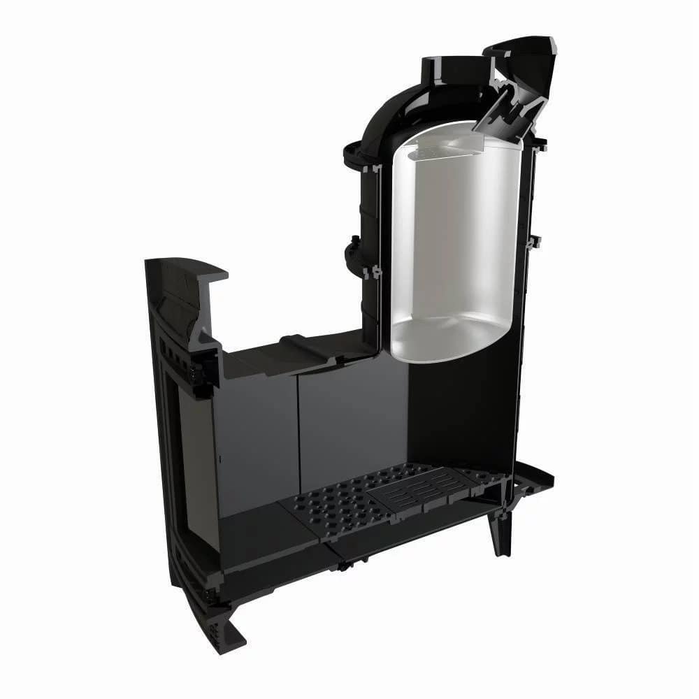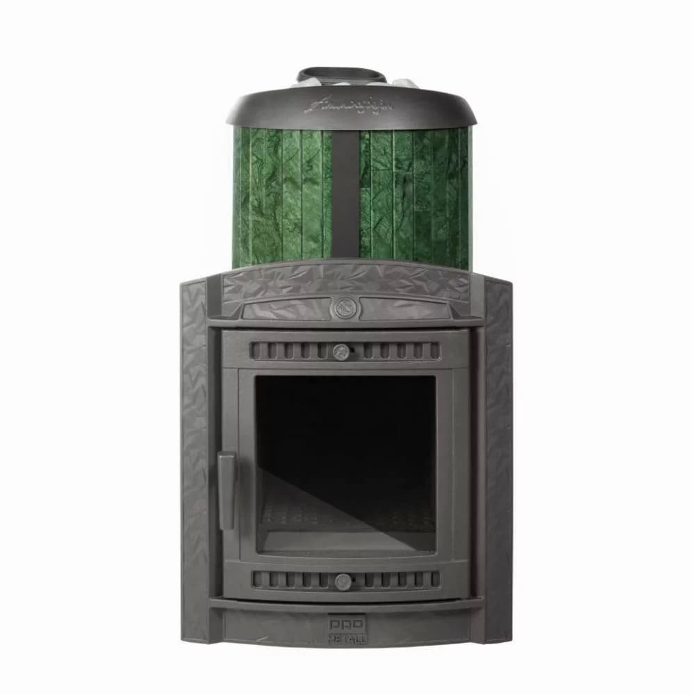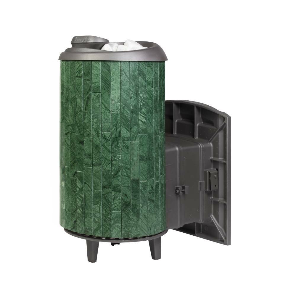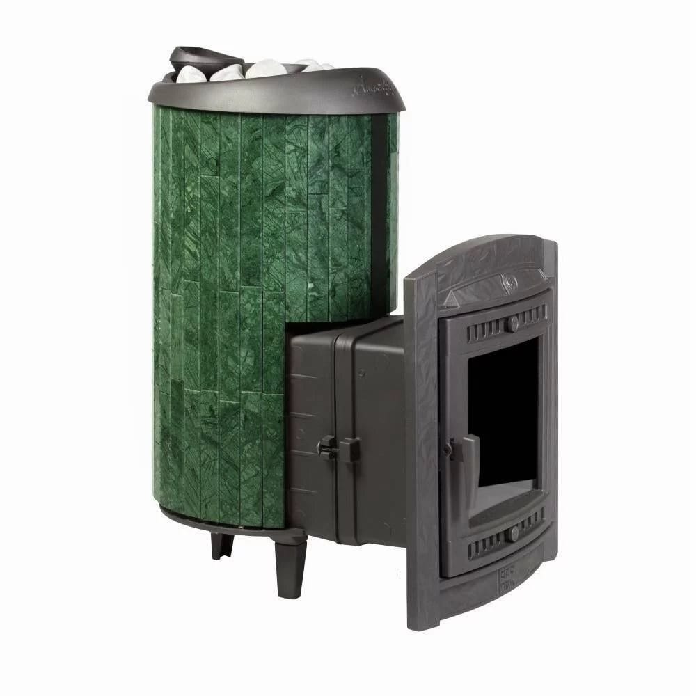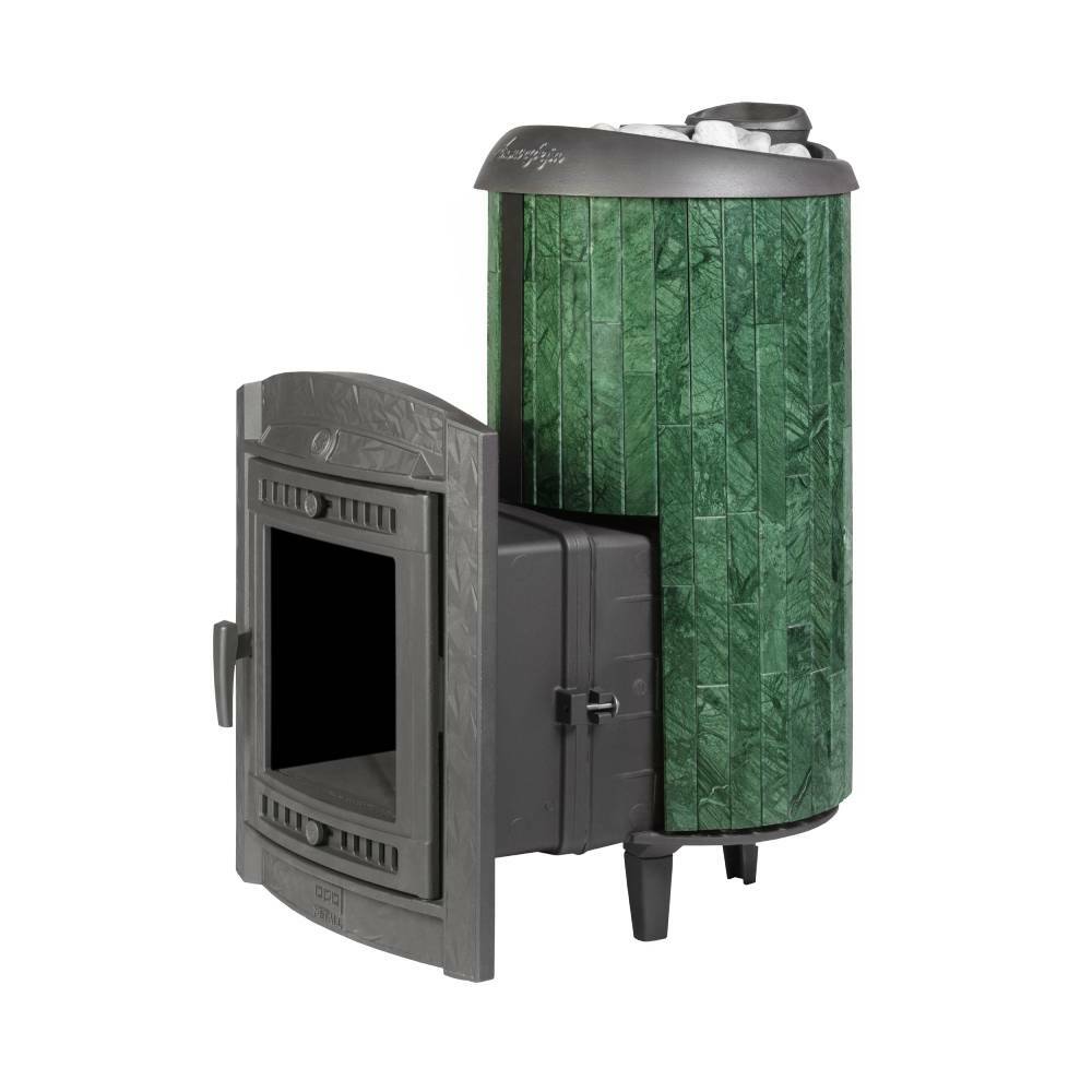 Дровяная печь Атмосфера XL в ламелях из натурального камня Верде Гватемала наборный - модель с увеличенной каменкой и повышенной производительностью. Ламели из натурального камня по периметру внешней каменки не только обладают хорошими теплонакопительными свойствами, но и придают печи оригинальный внешний вид. При изготовлении печи используется жаропрочный чугун с добавлением хрома. Закрытая каменка выполнена из стали марки AISI 439. Толщина чугунных стенок топочной камеры составляет 9-11 мм, каменки 3 мм. Большая масса камней и закрытая каменка позволяют получить режим русской бани и сохранять температуру долгое время. Толщина жаростойкого стекла топочной дверцы составляет 4 мм.