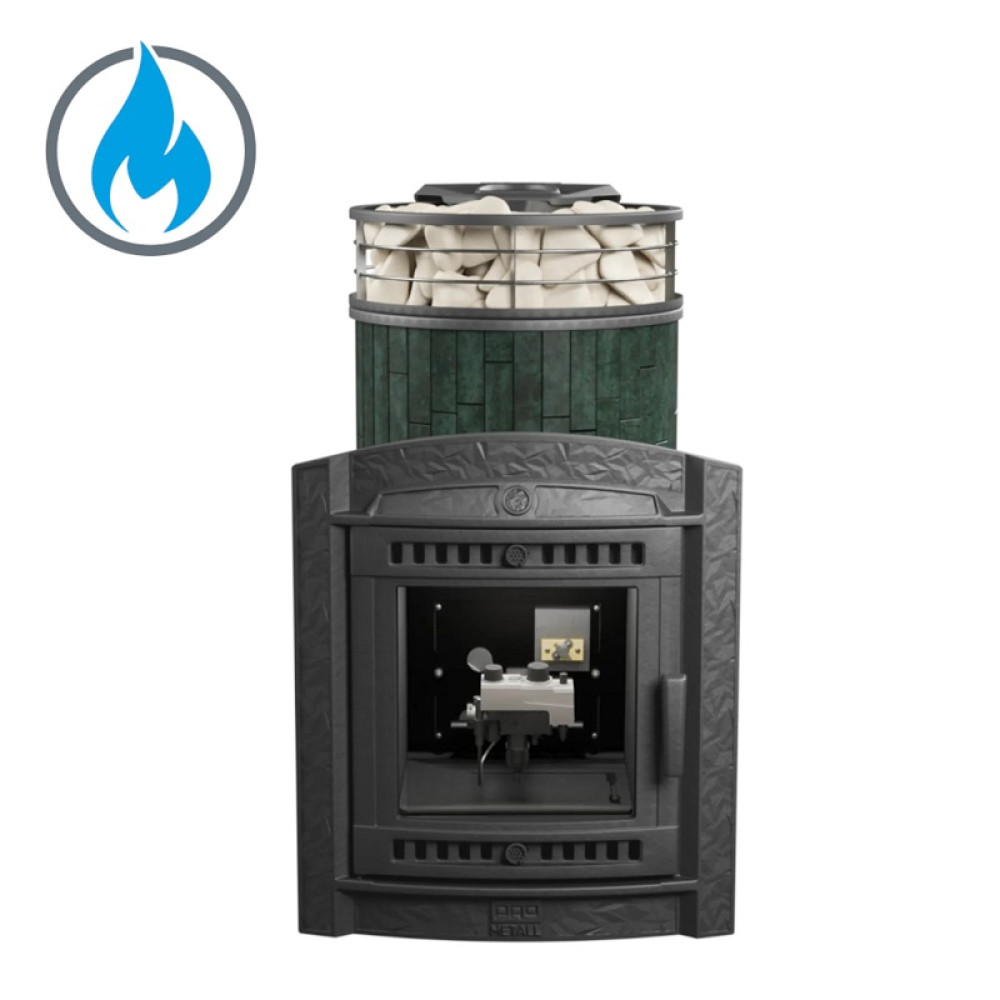 Печь для бани Атмосфера L Верде Гватемала ламель+сетка с газовой горелкой - практичная и компактная модель. Ламели из натурального камня по периметру внешней каменки не только обладают хорошими теплонакопительными свойствами, но и придают печи оригинальный внешний вид. При изготовлении печи используется жаропрочный чугун с добавлением хрома. Закрытая каменка выполнена из стали марки AISI 439. Толщина чугунных стенок топочной камеры составляет 9-11 мм, каменки 3 мм. Большая масса камней и закрытая каменка позволяют получить режим русской бани и сохранять температуру долгое время. Толщина жаростойкого стекла топочной дверцы составляет 4 мм.