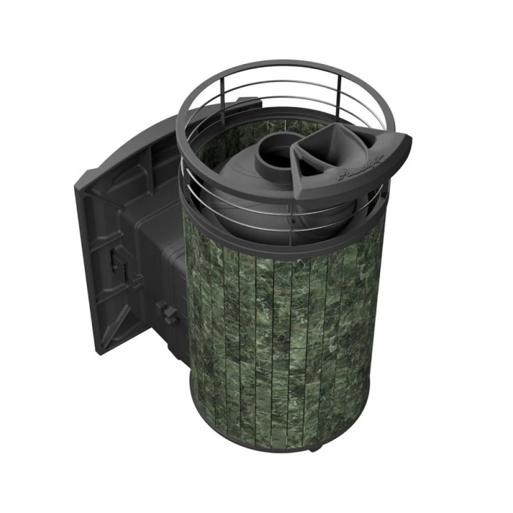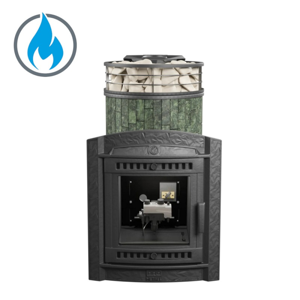 Печь для бани Атмосфера L Змеевик ламель+сетка с газовой горелкой - практичная и компактная модель. Ламели из змеевика по периметру внешней каменки не только обладают хорошими теплонакопительными свойствами, но и придают печи оригинальный внешний вид. При изготовлении печи используется жаропрочный чугун с добавлением хрома. Закрытая каменка выполнена из стали марки AISI 439. Толщина чугунных стенок топочной камеры составляет 9-11 мм, каменки 3 мм. Большая масса камней и закрытая каменка позволяют получить режим русской бани и сохранять температуру долгое время. Толщина жаростойкого стекла топочной дверцы составляет 4 мм.