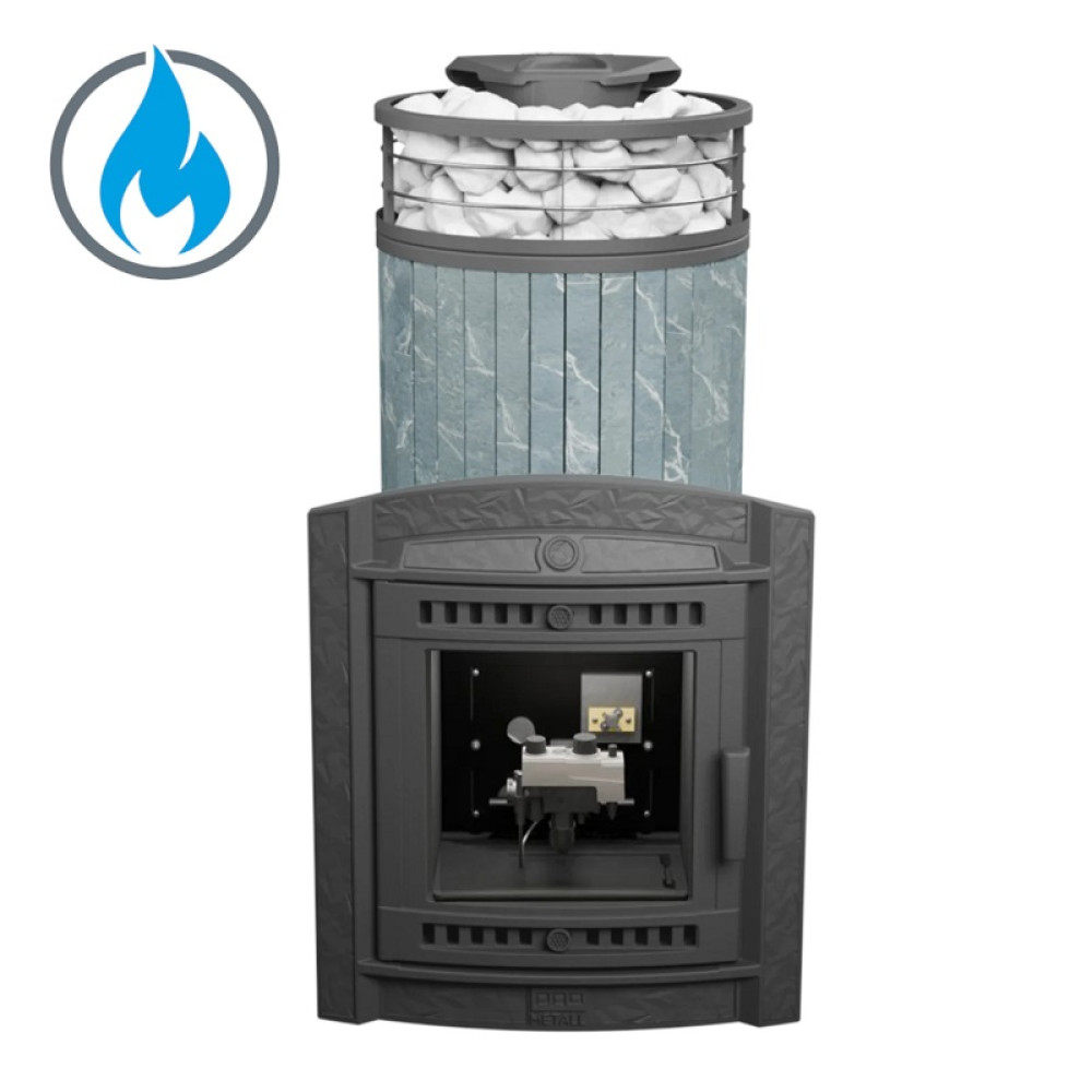 Печь для бани Атмосфера XL Талькохлорит ламель+сетка с газовой горелкой - модель с увеличенной каменкой и повышенной производительностью. Ламели из талькохлорита по периметру внешней каменки не только обладают хорошими теплонакопительными свойствами, но и придают печи оригинальный внешний вид. При изготовлении печи используется жаропрочный чугун с добавлением хрома. Закрытая каменка выполнена из стали марки AISI 439. Толщина чугунных стенок топочной камеры составляет 9-11 мм, каменки 3 мм. Большая масса камней и закрытая каменка позволяют получить режим русской бани и сохранять температуру долгое время. Толщина жаростойкого стекла топочной дверцы составляет 4 мм.