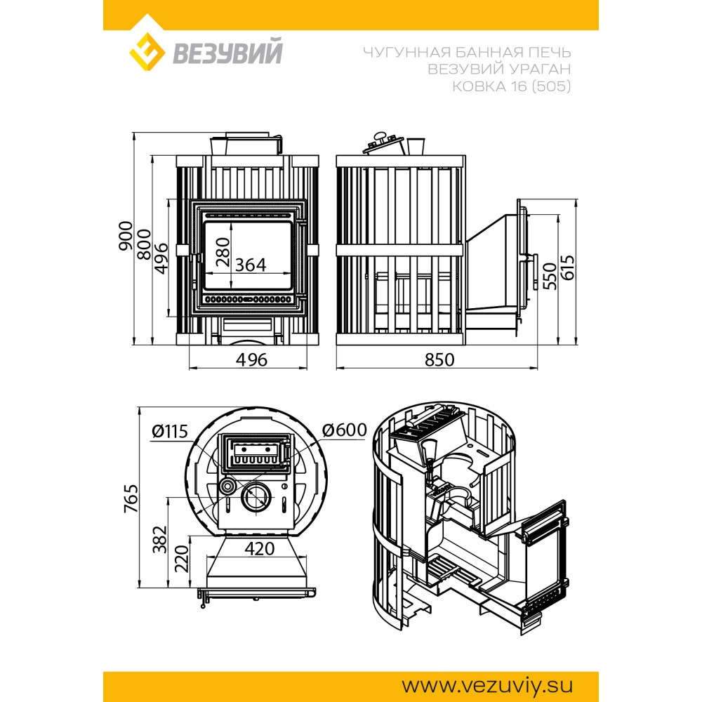 Банная чугунная печь Везувий Ураган Ковка 16 (505) предназначена для обогрева парной объемом 8-18 м3. Укомплектована чугунной дверцей Везувий 505. Закрытая каменка изготовлена из стали. Конвекционно-вентилируемый кожух Ковка изготовлен из металлической полосы, окрашен черной термостойкой краской и покрыт патиной Бронза.