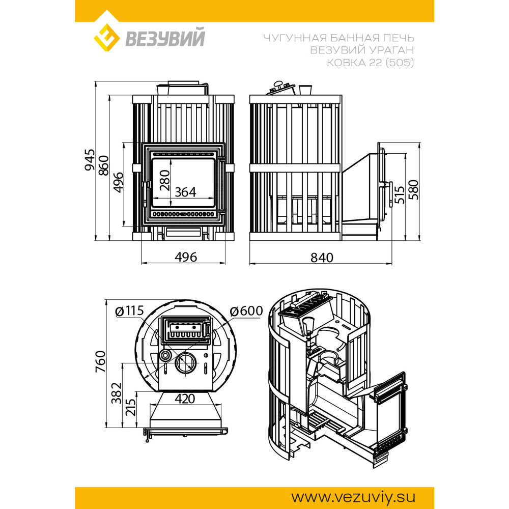 Банная чугунная печь Везувий Ураган Ковка 22 (505) предназначена для обогрева парной объемом 12-24 м3. Укомплектована чугунной дверцей Везувий 505. Закрытая каменка изготовлена из стали. Конвекционно-вентилируемый кожух Ковка изготовлен из металлической полосы, окрашен черной термостойкой краской и покрыт патиной Бронза.