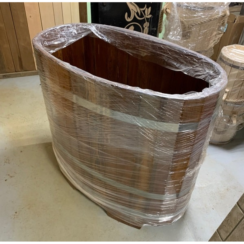 Купель овальная 0,59 х 1,06 х 1,0 изготовлена из отборной натуральной мореной лиственницы. Поверхность покрыта специальным составом, придающим купели высокую устойчивость к внешнему воздействию и дополнительную влагостойкость.