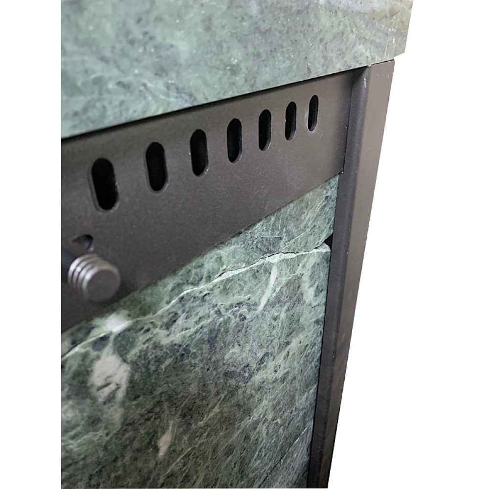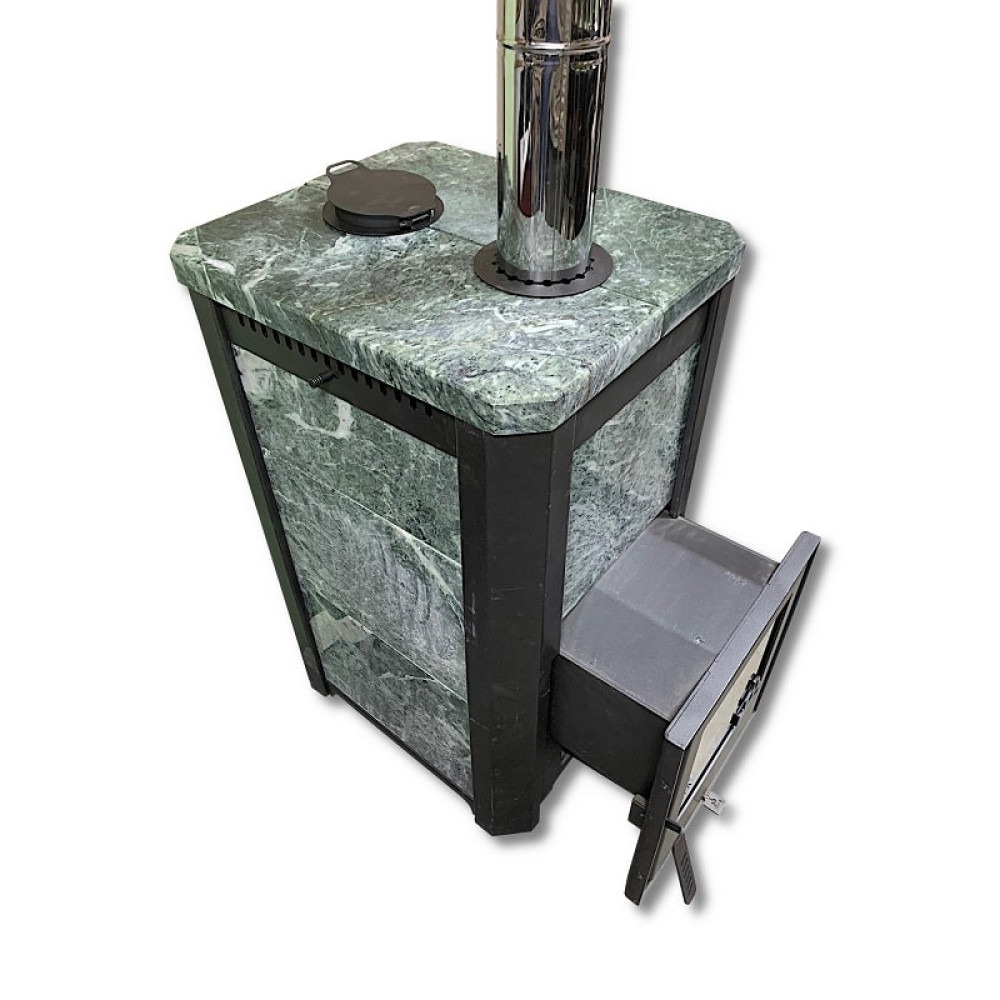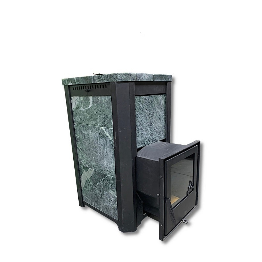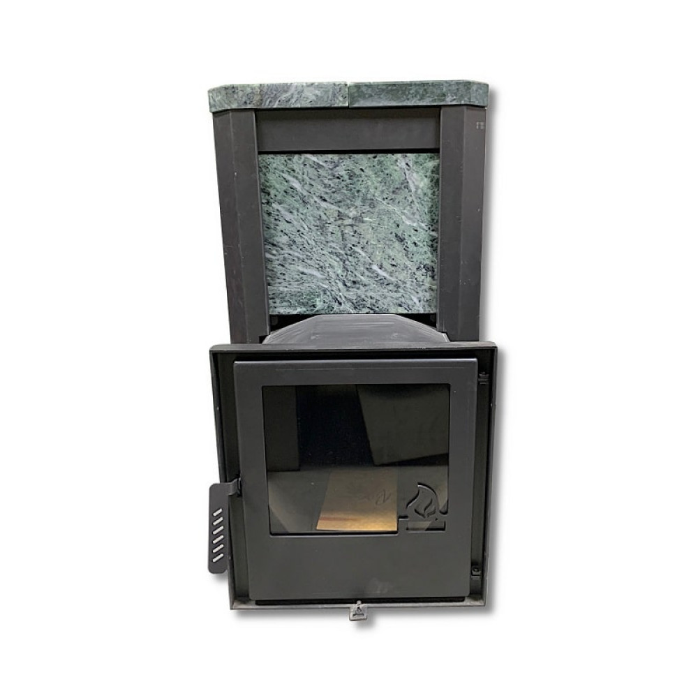 Дровяная печь Варвара Сказка с каменкой открытого типа и внешней облицовкой из змеевика предназначена для парных объемом до 24 м3. Каменка находится в верхней части корпуса печки, что позволяет прогревать воздух в помещении за очень короткое время. Змеевик аккумулирует тепло и отдает его в течение продолжительного времени. Наружная облицовка в сочетании с панорамным стеклом помимо практичности создают декоративный эффект.